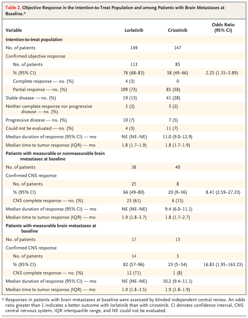 比較勞拉替尼與克唑替尼的 III 期 CROWN 研究實現了 HR 0.28 的同類最佳差異 PFS 獲益,基于此在 2021 年 3 月獲得 FDA 的一線批準。通過盲法獨立中央審查評估的確認客觀反應的患者百分比,勞拉替尼明顯高于克唑替尼(76% [95% CI,68 至 83] 對 58% [95% CI,49 至 66])。在基線時有可測量的 CNS 轉移的 30 名患者中,勞拉替尼組 82%(95% CI,57 至 96)和克唑替尼組 23%(95% CI,5 至 54)有顱內反應。