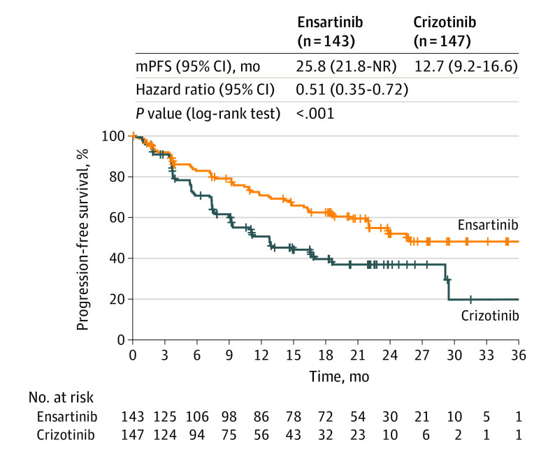 比較恩沙替尼與克唑替尼一線治療 ALK+ NSCLC 的 III 期 eXalt3 研究數據顯示,恩沙替尼組和克唑替尼組中位無進展生存(PFS)分別為25.8和12.7月(HR 0.51,95%CI 0.35-0.72)。顱內應答率方面來看,恩沙替尼也是碾壓克唑,兩組腦轉移患者ORR分別為64%和21%。