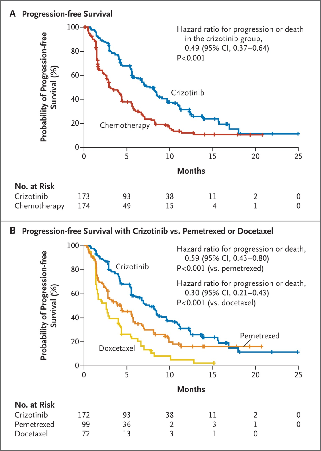 克唑替尼是一流的第一代 ALK TKI,其開發徹底改變了 ALK+ NSCLC 的治療。克唑替尼是受體酪氨酸激酶 ALK、ROS1 和 c-MET 的小分子抑制劑。在 I 期和 II 期研究中,克唑替尼在晚期 ALK 陽性 NSCLC 患者中表現出持久的反應導致 FDA 在 2016 年加速批準。在 III 期研究 PROFILE 1007 中,與化療相比,克唑替尼首先顯示出 PFS 改善一線和以前接受過治療的患者。