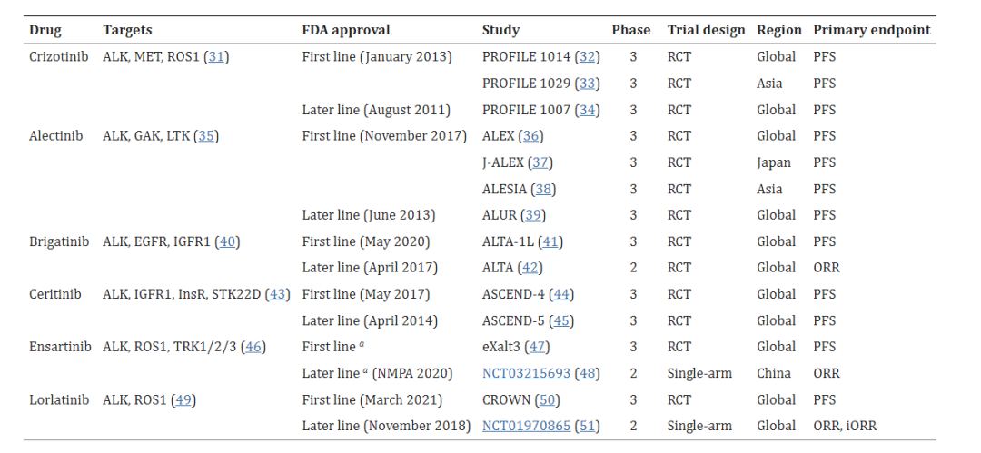 目前批準用于晚期 ALK+ NSCLC 的六種 ALK TKI 分為三代。藥物靶點、FDA 批準的適應癥、試驗設計和臨床試驗的主要終點總結如下。