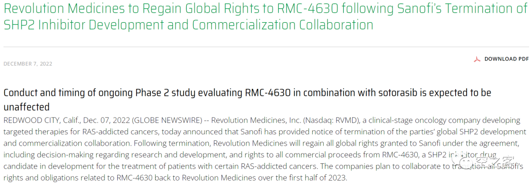 12月7日,Revolution Medicines宣布,Sanofi已終止在SHP2抑制劑RMC-4630上的合作,這個(gè)曾經(jīng)在臨床前階段就達(dá)到$50m upfront + >$500m milestone的地標(biāo)性交易就此終結(jié)。