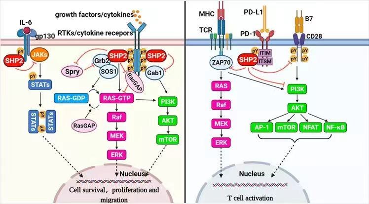 SHP2蛋白是一種去磷酸化酶,屬于PTP家族,作為Ras-Raf-MEK-ERK、JAK-STAT、PI3K-AKT-mTOR和PD-1/PD-L1等多種經(jīng)典信號(hào)通路的匯聚節(jié)點(diǎn),可以增強(qiáng)或拮抗與經(jīng)典細(xì)胞存活相關(guān)的和具有底物特異性的免疫調(diào)節(jié)途徑,在腫瘤中具有雙面作用,既可以作為磷酸酶發(fā)揮顯著的致癌功能,也可以以環(huán)境依賴的方式作為腫瘤抑制因子。
