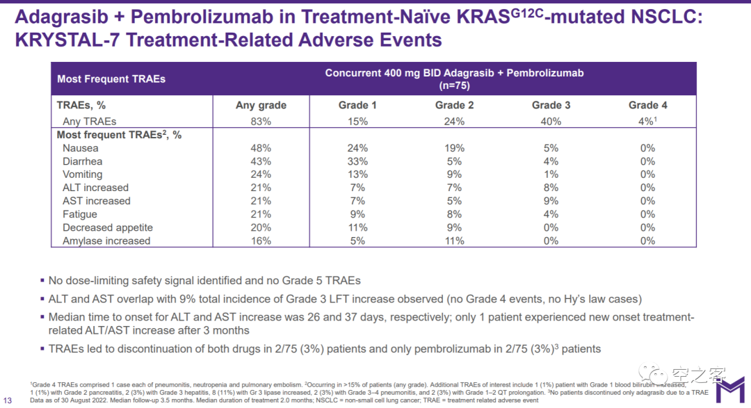 安全性上,倒相對(duì)還算比較正面,3級(jí)和4級(jí)的TRAE發(fā)生率在40%和4%,有2例TRAE導(dǎo)致的停藥、但也只是停K藥。
