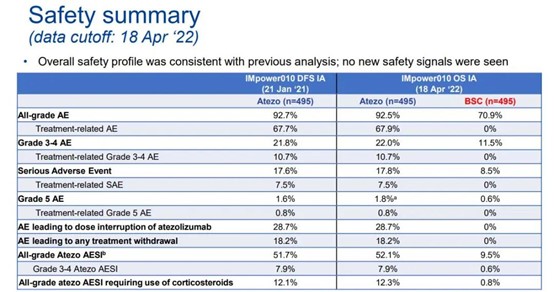 阿替利珠單抗組和BSC組患者中分別有22.0%和11.5%患者發(fā)生3-4級不良事件(AE),兩組的5級AE發(fā)生率為分別為 0.8%和0%。在接受阿替利珠單抗治療的患者中,52.1%發(fā)生特殊的AE;7.9%為3-4級,0.4%為5級(肺炎/間質性肺疾病和心肌炎)。DFS IA臨床截止日期后未發(fā)生新的5級AE。