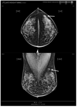 一位44歲的患者被診斷為左乳有一個20毫米大小的三陰性亞型浸潤性導管癌,分期為T1cN0。左側乳腺癌在1點鐘方向表現為腫塊(箭頭),被AI-CAD遺漏(異常評分7分)