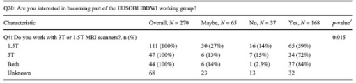 表 受訪者同時使用1.5T和3T掃描儀或僅使用3T掃描儀進行臨床工作與加入掃描儀工作組的意愿之間的關系