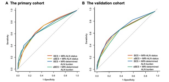 本研究共納入1092名患者。BES被確定為初級(n = 677)和驗證(n = 415)隊列中pALN負荷的獨立預測因素。使用MRI-ALN狀態的分析顯示,BES顯著提高了pALN負荷的預測性能(AUC。0.65 vs 0.71,p < 0.001;IDI = 0.045,p < 0.001;連續NRI = 0.159,p = 0.050)。這些結果在驗證隊列中得到了證實(AUC。0.64 vs 0.69, p = 0.009; IDI = 0.050, p < 0.001; 連續NRI = 0.213, p = 0.047)。此外,BES與侵襲性的臨床病理因素呈正相關(p < 0.05)。
