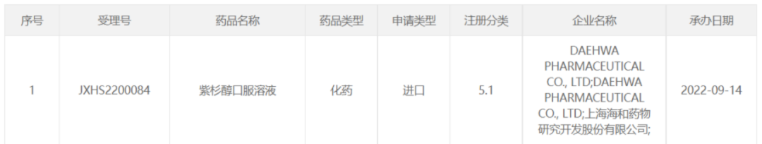 9月14日,CDE官網顯示,海和藥物和大化制藥合作開發的紫杉醇口服液的上市申請已獲受理,適應癥為二線治療晚期胃癌。
