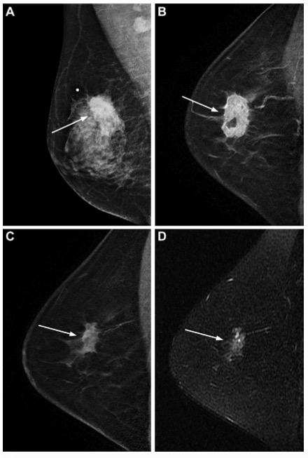 圖 一個被預測模型分層為低風險患者的代表圖像。一位54歲的女性,臨床上患有T3N2 Luminal型乳腺癌,在保乳手術和腋窩淋巴結清掃前接受了四個周期的多柔比星加環磷酰胺治療,隨后又接受了四個周期的多西他賽。手術組織病理學檢查顯示,殘留的1厘米浸潤性導管癌沒有淋巴管浸潤,14個切除的結中有兩個淋巴結轉移。患者接受了輔助性的放射治療和輔助性的內分泌治療。(A)新輔助化療(NAC)前的乳房內側斜位檢查顯示一個不規則的腫塊,沒有微鈣化(箭頭)。新輔助化療前和新輔助化療后的矢狀位增強T1加權MRI掃描(B)顯示一個不規則形腫塊(箭頭)。(D)NAC后矢狀面T2加權MRI顯示一個不規則形腫塊(箭頭),沒有瘤周水腫。該患者被歸類為低風險(遠處轉移15分,死亡18分),遠處轉移(54歲0分+臨床N2期5分+無淋巴管侵犯0分+無瘤周水腫0分=5分)和死亡(54歲0分+臨床T3期5分+無微鈣化0分+無瘤周水腫0分=5分)分別得分為5分。術后10年,患者仍然存活,沒有遠處轉移