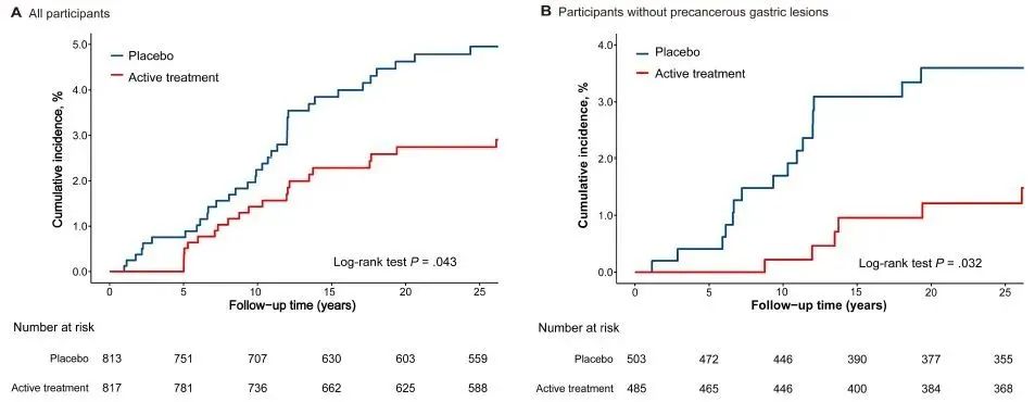 在26.5年隨訪期間,治療組和安慰劑組分別有21位(2.57%)和35位(4.31%)受試者被確診為胃癌。與接受安慰劑處理的對照相比,接受幽門螺旋桿菌治療的受試者胃癌的發生率較低(風險比[HR] 0.57)。在基線無胃癌癌前病變和無消化不良癥狀的受試者中,根除幽門螺旋桿菌的胃癌風險降低更為明顯(HR分別是0.37和0.44)。此外,與安慰劑組527位持續性幽門螺旋桿菌感染的受試者中觀察到的32例胃癌相比,成功根除幽門螺旋桿菌的625位受試者中只發現了16例胃癌(HR 0.46)。但是,兩組的任何死亡終點之間都沒有顯著差異。