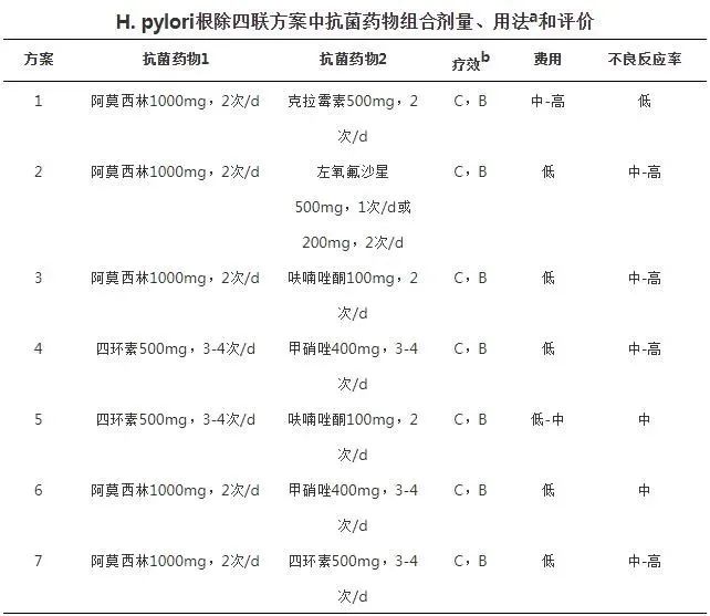 注:a標準劑量質子泵抑制劑+標準劑量鉍劑(2次/d,餐前小時口服)+2種抗菌藥物(餐后口服)。標準劑量質子泵抑制劑為艾司奧美拉唑20mg,雷貝拉唑10mg(或20mg)、奧美拉唑20mg,蘭索拉唑30mg,泮托拉唑40mg,艾普拉唑5mg,以上選一;標準劑量鉍劑為枸櫞酸鉍鉀220mg(果膠鉍標準劑量待確定);b療效按Graham分級:C級為85%-90%,B級為90%-94%