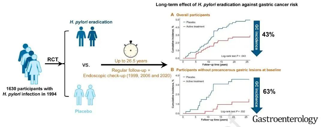 這是一項在我國南方胃癌高風險去開展的前瞻性、隨機、安慰劑為對照的臨床試驗。自1994年7月期,共招募了1630位無癥狀的幽門螺旋桿菌感染者,隨機(1:1)分組接受幽門螺旋桿菌根除治療的標準三聯療法(n=817)或安慰劑(n=813),然后隨訪至2020年12月。主要終點是胃癌的發生率。次要終點是總死亡率和原因特異性的死亡率。
