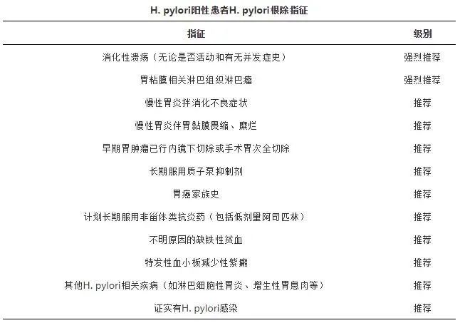 H.pylori所致胃炎作為一種感染性疾病,似乎所有的H.pylori陽性者均有必要治療,但應該看到,目前我國的H.pylori感染率仍達約50%,主動篩查所有的H. pylori陽性者并進行治療目前難以達成,現階段仍然需要遵從根除H. pylori指征(下表),以便主動對獲益較大的個體進行H. pylori檢測和治療。