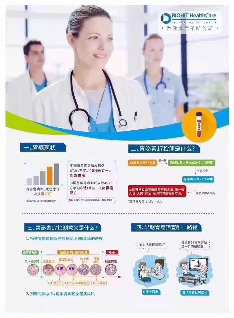 4、用胃泌素17進(jìn)行初篩,可有效發(fā)現(xiàn)胃癌高風(fēng)險(xiǎn)人群,大幅提高我國胃癌的早診早治率,并對(duì)胃病防治具有積極意義。
