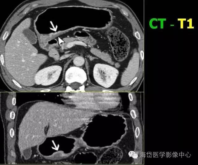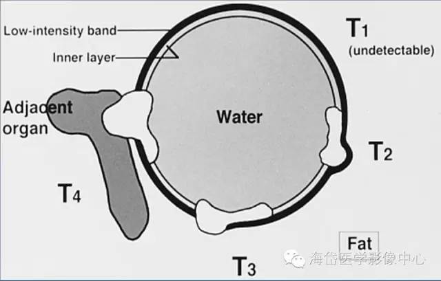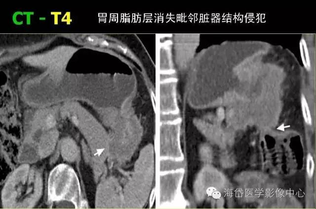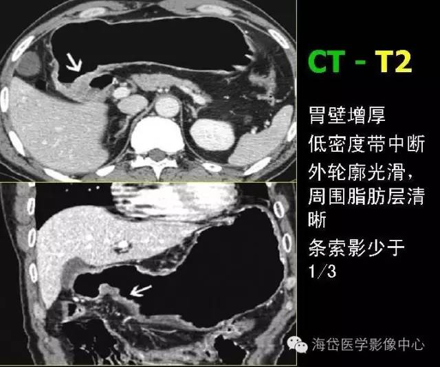 T2:胃壁增厚,低密度帶中斷,外輪廓光滑,周圍脂肪層清晰條索影少于1/3