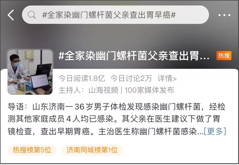 山東濟南一36歲男子體檢發現感染幽門螺桿菌,經檢測其他家庭成員4人均已感染。其父親在醫生建議下做了胃鏡檢查,查出早期胃癌,經過手術目前恢復良好。主治醫生介紹幽門螺桿菌感染會導致慢性活動性胃炎、消化性潰瘍等疾病,如終生不殺菌約5%的患者會發生胃癌。醫生提示,幽門螺桿菌經口傳播,個人如發現感染,建議其他家庭成員一同檢測做主動篩查。醫院就診或在疫情下選擇居家自測。