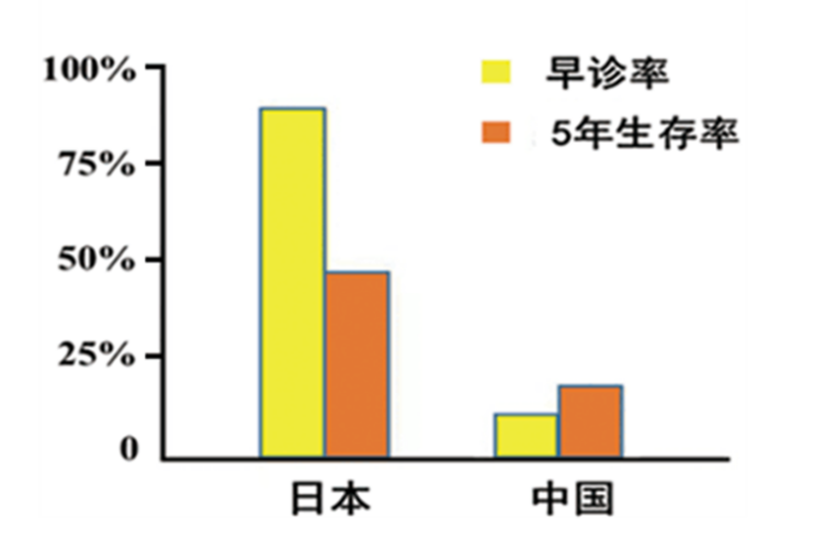 胃癌的預后與診治時機密切相關,早期胃癌內鏡下或手術切除后,10年生存率可達90%,而進展期胃癌的5年生存率低于30%,但是目前我國早期胃癌的早診率低于10%,遠遠低于日本。(圖2)
