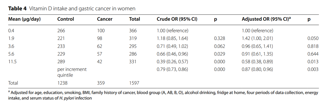 在調整年齡,教育,吸煙,BMI,癌癥家族史,血型(A,AB,B,O),飲酒,家用冰箱,四個時期的數據收集,能量攝入和幽門螺桿菌感染的血清狀態后,還觀察到維生素D攝入量五分位數的每次升高,調整后的OR穩步下降(調整后的OR和95%CI: 0.91 (0.86-0.96), p = 0.000)。與最低的五分位數相比,在最高的第5個五分位數發現GC風險降低有統計學意義(調整后的OR和95%CI,第5個與第1個五分位數:0.68(0.53-0.86),p = 0.002)。