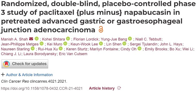 Manish A. Shah, Kohei Shitara, Florian Lordick, et al. Randomized, double-blind, placebo-controlled phase 3 study of paclitaxel {plus minus} napabucasin in pretreated advanced gastric or gastroesophageal junction adenocarcinoma. Clin Cancer Res 2022; clincanres.4021.2021. https://doi.org/10.1158/1078-0432.CCR-21-4021.