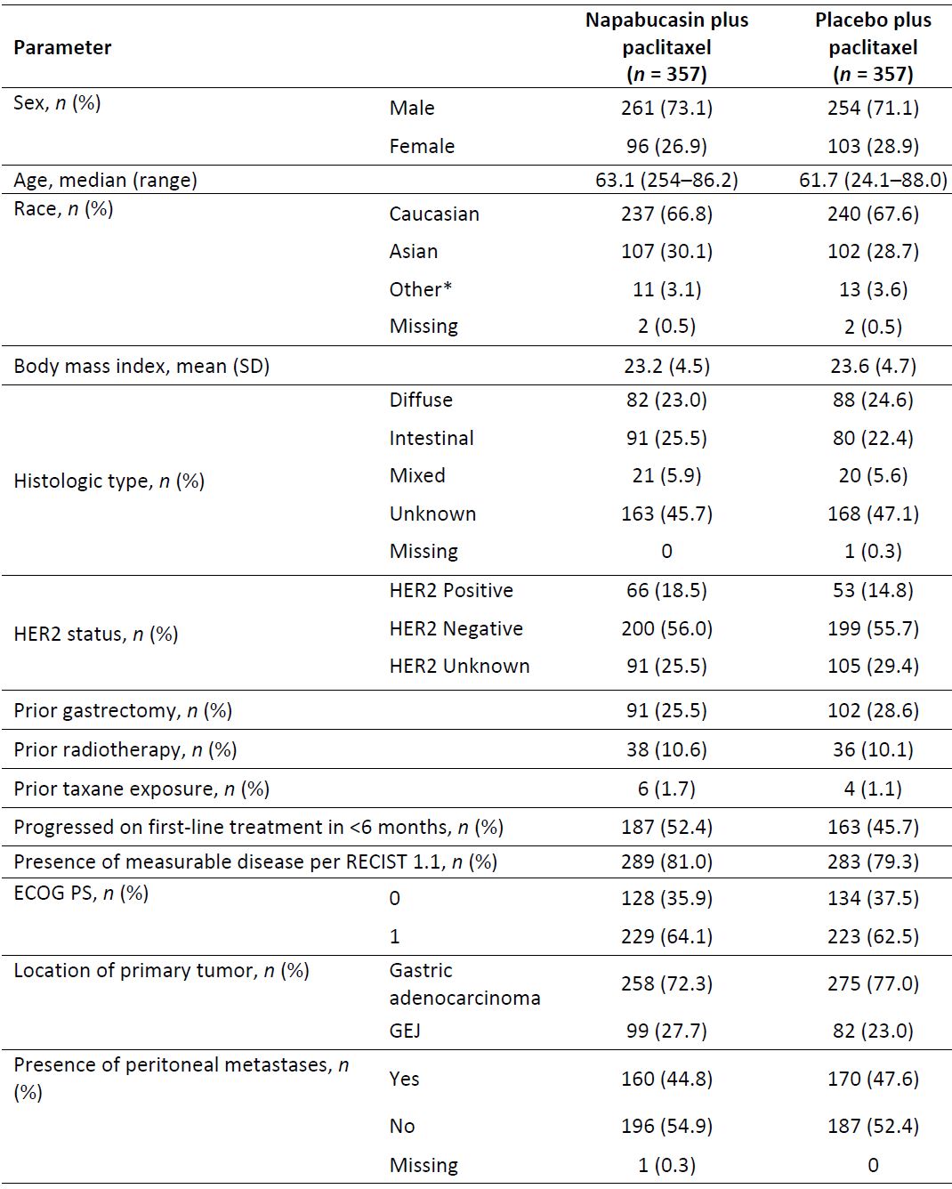 總體上,共有714位患者被隨機(jī)分至Napabucasin聯(lián)合紫杉醇組(n=357)和單用紫杉醇組(n=357)。72.1%的男性,74.6%的患者是胃腺癌,46.2%的患者已發(fā)生腹膜轉(zhuǎn)移。380位患者死亡后進(jìn)行了中期分析。565位患者死亡時(shí)(中位隨訪了6.8個月)進(jìn)行了最終療效分析。