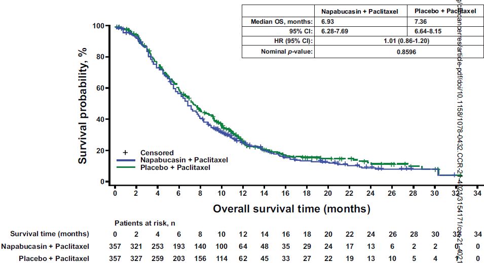 BRIGHTER研究是一項(xiàng)雙盲、隨機(jī)的3期臨床試驗(yàn),受試患者被隨機(jī)(1:1)分至Napabucasin(480 mg,2次/日,口服)聯(lián)合紫杉醇(80 mg/m2·周,3周/4周)組或安慰劑聯(lián)合紫杉醇組。主要終點(diǎn)是總生存期(OS)。次要終點(diǎn)包括無進(jìn)展生存期(PFS)、客觀緩解率(ORR)、疾病控制率(DCR)和安全性。