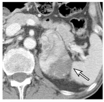 圖 一名67歲的男性,患有乙狀結腸癌。增強CT圖像顯示左側腎上腺有一個74毫米的結節(箭頭)。腎上腺切除術后,該結節被證實為腎上腺皮質癌。結腸癌經息肉切除術后確認為PT1期