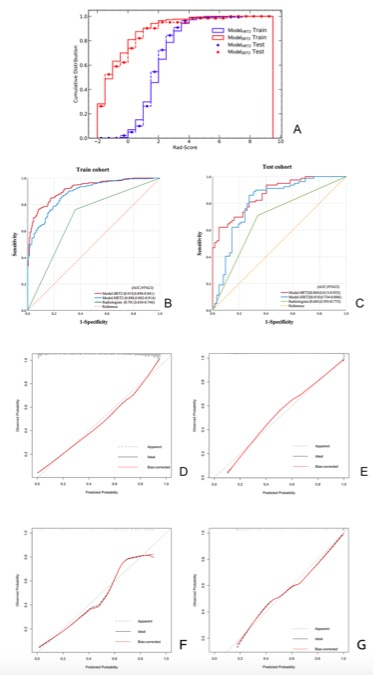 圖 模型評(píng)估。A Rad分?jǐn)?shù)的累積分布曲線。訓(xùn)練(B)和測(cè)試(C)隊(duì)列的ROCs。校準(zhǔn)曲線顯示了兩個(gè)隊(duì)列中模型的良好校準(zhǔn)(D-G)