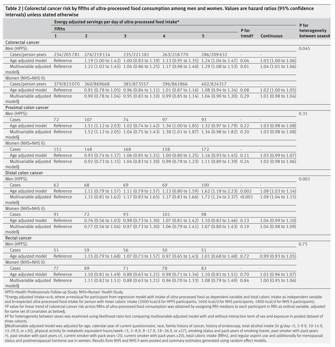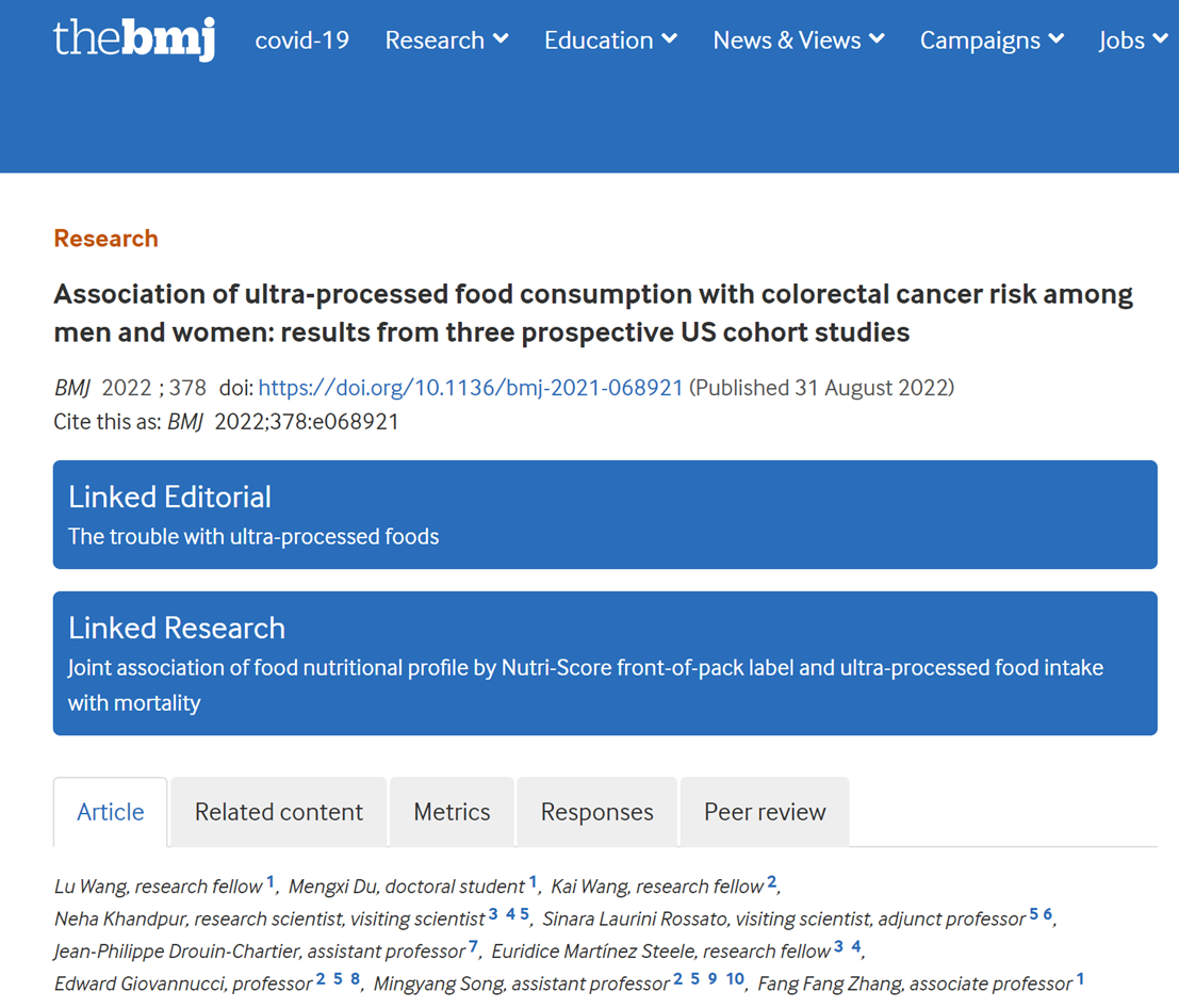 Lu Wang, et al. Association of ultra-processed food consumption with colorectal cancer risk among men and women: results from three prospective US cohort studies.BMJ 2022;378:e068921