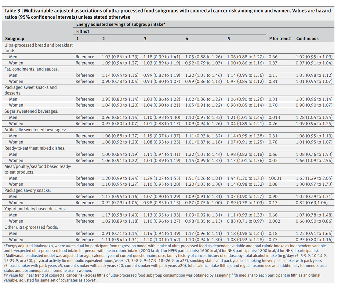 在超加工食品的亞類中,以肉類/家禽/海鮮為基礎的即食產品(風險比最高的五分之一為1.44,風險比最低的五分之一為1.20至1.73; 趨勢P <0.001)和加糖飲料(1.21,1.01至1.44;男性趨勢P =0.013),女性的即食/熱混合菜肴(1.17,1.01至1.36;趨勢P =0.02) 的消費量較高與結直腸癌風險增加相關。在女性中,酸奶和乳制品甜點與結直腸癌的風險呈負相關(風險比0.83,0.71 - 0.97;趨勢P = 0.002)。