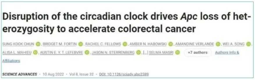 這項研究的標題是“Disruption of the circadian clock drives Apc loss of heterozygosity to accelerate colorectal cancer”,于8月10日發表在《Science Advances》雜志上。