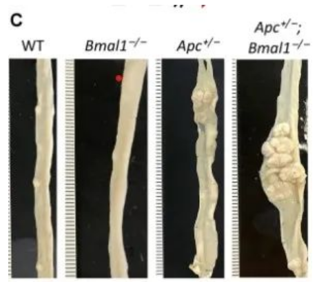 在研究過程中,科學家們開發了一種新的組織特異性基因工程小鼠模型(GEMM)來定義連接晝夜節律破壞和CRC發病機制的分子途徑。研究結果表明,與單獨使用Apc的破壞相比,腸道Apc和Bmal1的遺傳缺失導致息肉形成在統計學上顯著增加。他們還證明了環境對生物鐘的破壞會加速APC突變,從而增加了GEMM小鼠模型中的腫瘤負擔。