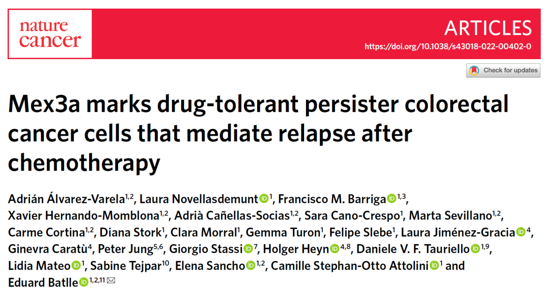 近日,西班牙巴塞羅那科學技術學院的研究人員在 Nature 子刊 Nature Cancer 發表了題為:Mex3a marks drug-tolerant persister colorectal cancer cells that mediate relapse after chemotherapy 的研究論文。