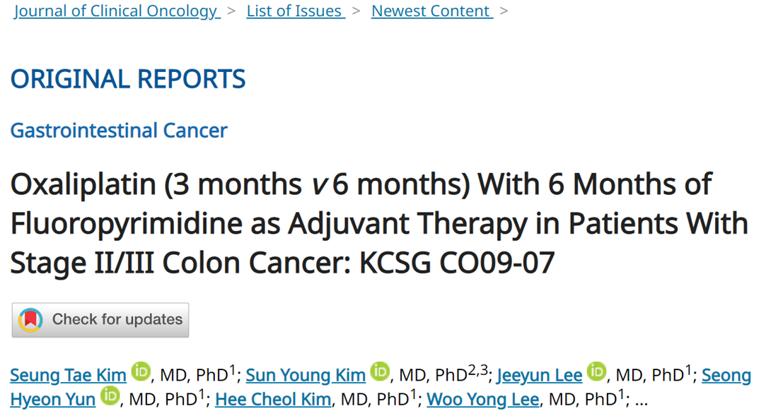 Kim ST, Kim SY, Lee J, Yun SH, Kim HC, Lee WY, Kim TW, Hong YS, Lim SB, Baek JY, Oh JH, Ahn JB, Shin SJ, Han SW, Kim SG, Kang SY, Sym SJ, Zang DY, Kim YH, Choi IS, Kang JH, Kim MJ, Park YS. Oxaliplatin (3 months v 6 months) With 6 Months of Fluoropyrimidine as Adjuvant Therapy in Patients With Stage II/III Colon Cancer: KCSG CO09-07. J Clin Oncol. 2022 Jun 30:JCO2102962. doi: 10.1200/JCO.21.02962. Epub ahead of print. PMID: 35772045.