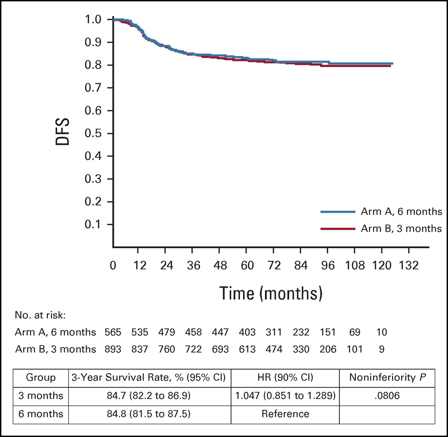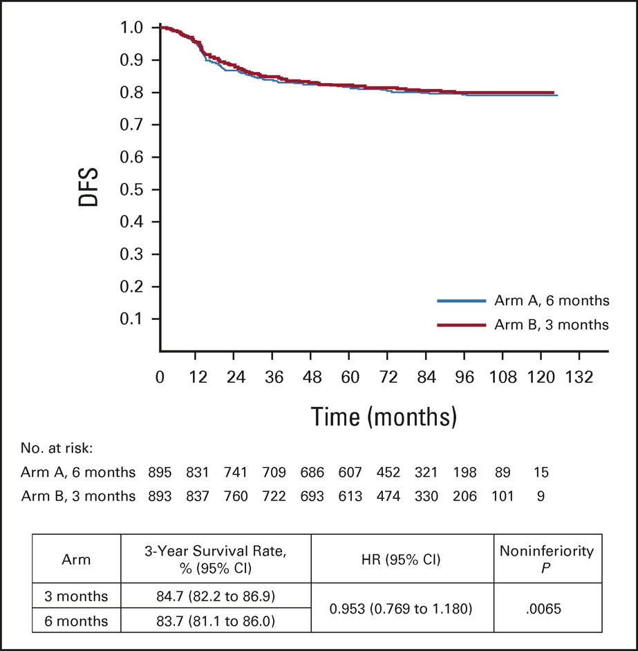 共1788例患者被隨機分配到6個月組(n = 895)和3個月組(n = 893),其中6個月組和3個月組分別有83.6%和85.7%的患者完成了治療。6個月組任何級別的神經病變率均高于3個月組(69.5% v 58.3%; P < .0001)。6個月和3個月組的3年DFS率分別為83.7%和84.7%,HR為0.953 (95% CI, 0.769 - 1.180;非劣效性檢驗,P = 0.0065)。