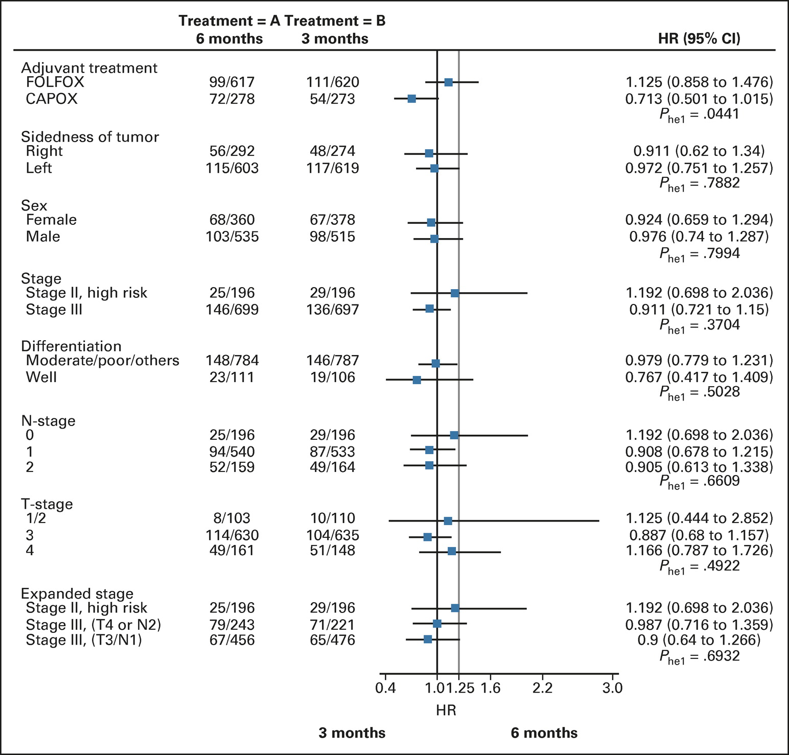 在接受卡培他濱+奧沙利鉑治療的III期CRC患者中,3個月組的3年DFS不低于6個月組的3年DFS, HR為0.713 (95% CI, 0.530 - 0.959;P = .0009)。然而,在接受輸注氟尿嘧啶、亞葉酸鈣和奧沙利鉑治療的高危II期和III期CRC患者中,3個月組與6個月組的非劣效性尚未得到證實。