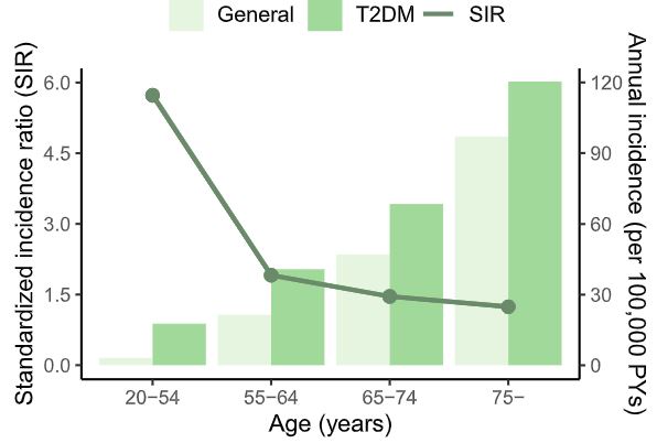 在連續八年的隨訪過程中,共發現了 1056 例胰腺癌病例。T2DM 患者的胰腺癌總體年發病率為 55.28/10萬人年,高于一般人群,標準化發病率(SIR)為 1.54。胰腺癌的發病率隨著年齡的增長而增加,在 T2DM 老年患者組中觀察到發病率顯著升高。但是,相對胰腺癌風險與 T2DM 發病年齡呈負相關,在 20-54 歲組中觀察到更高的 SIR 為 5.73。