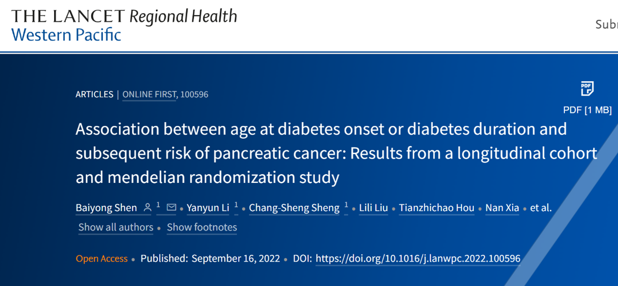 Baiyong Shen, et al. Association between age at diabetes onset or diabetes duration and subsequent risk of pancreatic cancer: Results from a longitudinal cohort and mendelian randomization study. The Lancet Regional Health - Western Pacific 2022;00: 100596 Published online xxx https://doi.org/10.1016/j. lanwpc.2022.100596.