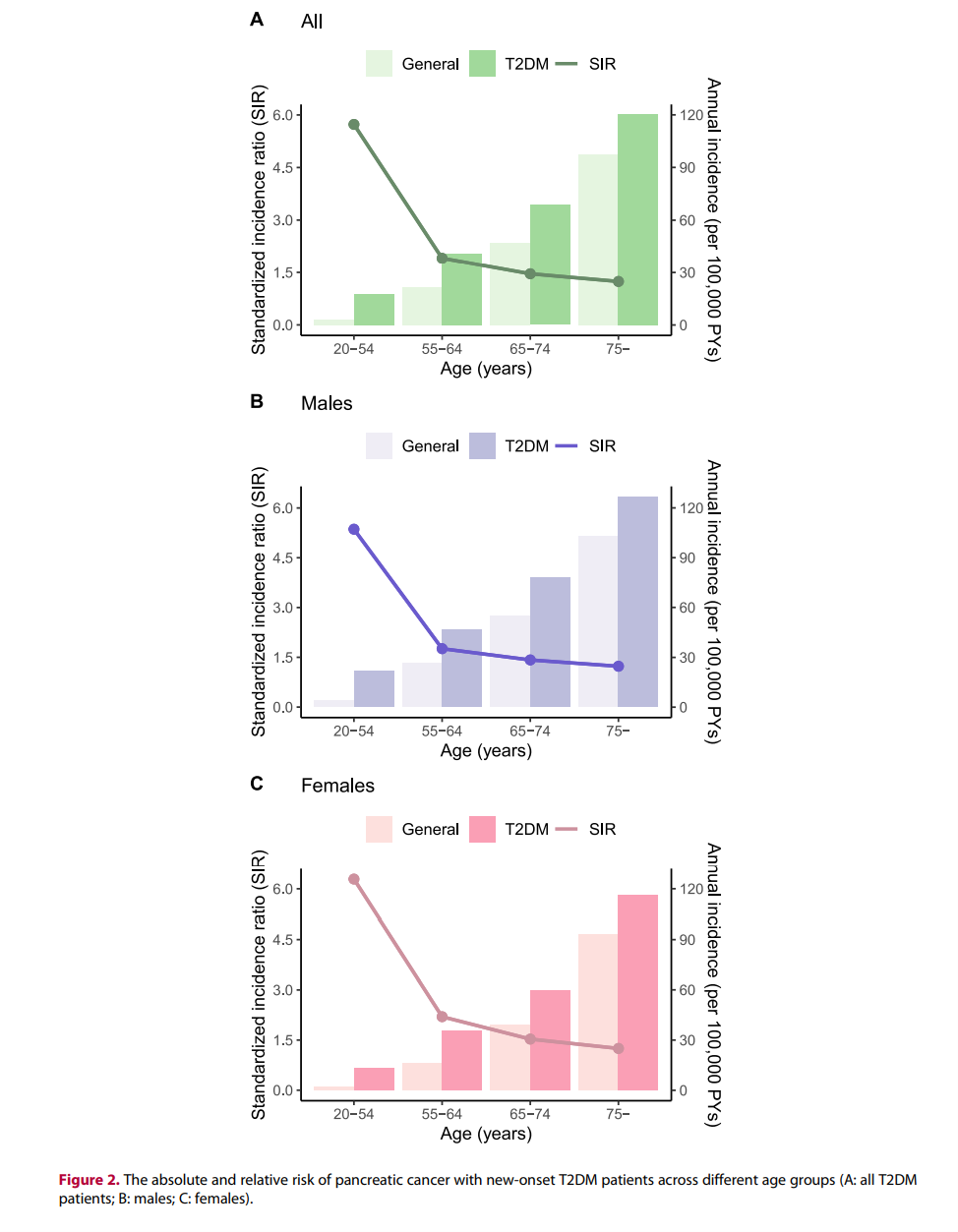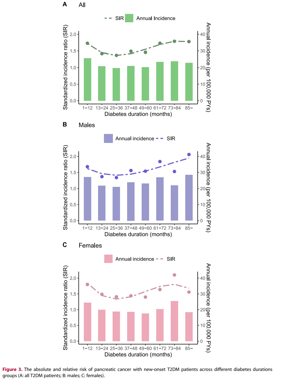 然而,相對胰腺癌風險以SIR表示,與T2DM發病時的年齡成反比,在20~54歲組中觀察到更高的SIR為5.73(95%CI,4.49–7.22)(圖2)。