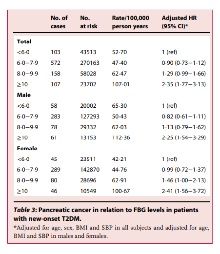 研究人員研究了各種FBG水平與新發T2DM患者患胰腺癌風險的關系。分類分析顯示,空腹血糖≥10.0 mmol/L組的胰腺癌風險明顯高于FBG較低的組。與<6.0 mmol/L的FBG相比,FBG≥10.0 mmol/L患者的胰腺癌風險比為2.35(95% CI;1.77–3.13)。(表3)