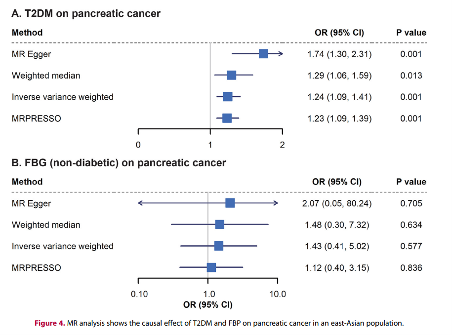 MR分析表明,T2DM與東亞人群中胰腺癌風險增加24%(OR:1.24,95%CI:1.09-1.41,p = 0.001)有關。然而,正常范圍內的FBG水平升高與胰腺癌風險沒有因果關系(p = 0.577)(圖4)。