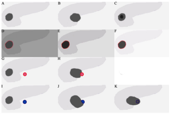 A 腫瘤位于胰腺頭部。CT圖像上觀察到胰腺周圍的腫瘤浸潤(B)和壞死(C)。D-F 在平掃、胰腺期和靜脈期繪制ROI,以評估衰減值。G-H 對腫瘤和主要動脈(包括腹腔干、肝總動脈和腸系膜上動脈)的評價是基于有無基底或包裹。I-K 對腫瘤和主要靜脈(包括門靜脈和腸系膜上靜脈)的評價按三個等級記錄
