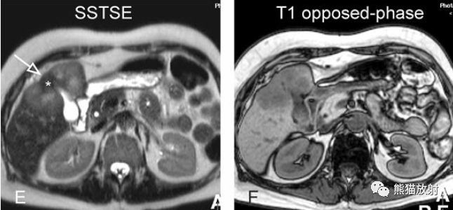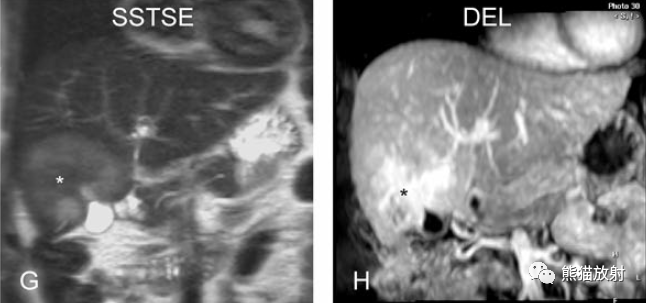 T2壓脂(T2 fatsat):膽囊窩內(nèi)膽囊癌病變較肝臟為高信號,病變頂部向肝內(nèi)擴(kuò)展;