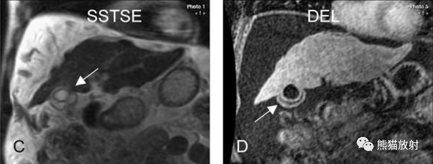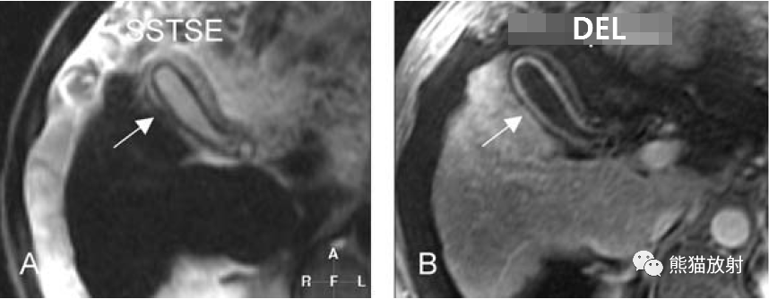 膽囊壁增厚(并肝硬化、門脈高壓、腹水)。T2WI顯示膽囊壁因水腫而光滑均勻增厚,增強(qiáng)延遲期顯示強(qiáng)化的膽囊壁(內(nèi)外兩層:粘膜層和漿膜層),薄而清晰光滑。