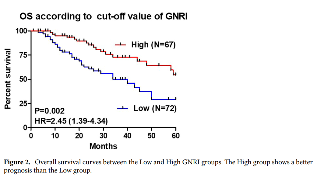 這項回顧性研究檢查了139名接受根治性胰腺切除術治療可切除胰腺癌的患者。所有患者均使用GNRI進行營養(yǎng)篩查,并隨訪POC診斷和患者結局,如OS。按GNRI值分為低組:N = 74,GNRI<99;以及高組:N = 65,GNRI≥99。