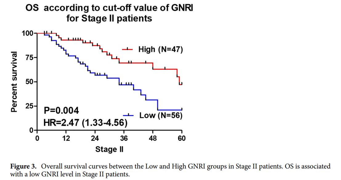 Kaplan-Meier分析和對數排名測試表明,GNRI <99的患者OS明顯低于高組的患者(p = 0.002;圖2)。GNRI值與OS作為預后標志物顯著相關。此外,根據GNRI臨界值比較II期患者,因為他們分別占低組和高組的77.8%和70.1%(圖3)。