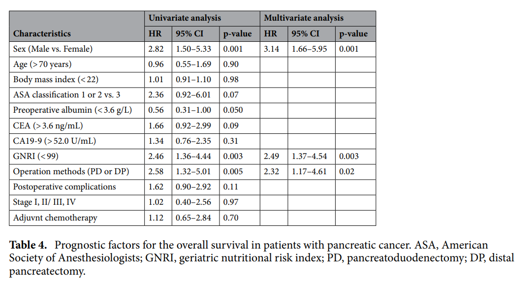 單變量分析表明,OS與GNRI臨界值顯著相關(p = 0.003)。多因素分析顯示,GNRI <99(HR: 2.45;95% CI: 1.02–5.86;p = 0.04)、性別(HR: 3.01; 95% CI: 1.57–5.77; p = 0.001)和外科手術(HR: 2.30; 95% CI: 1.16–4.55; p = 0.02)是OS的重要獨立預后潛在標志物(表4)。