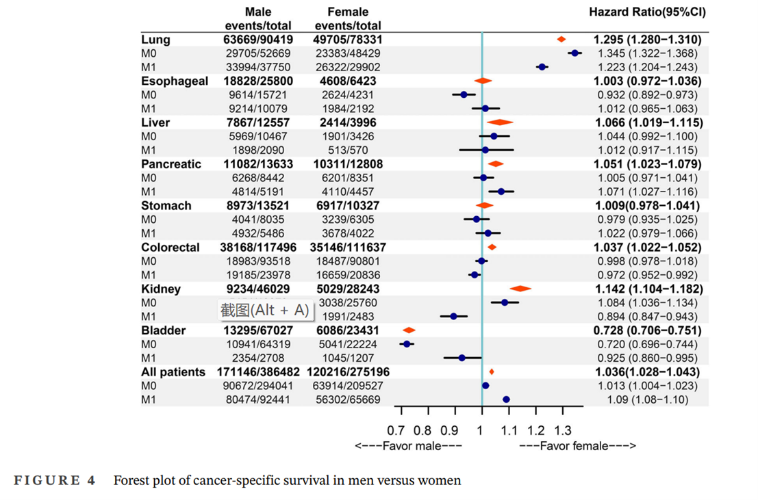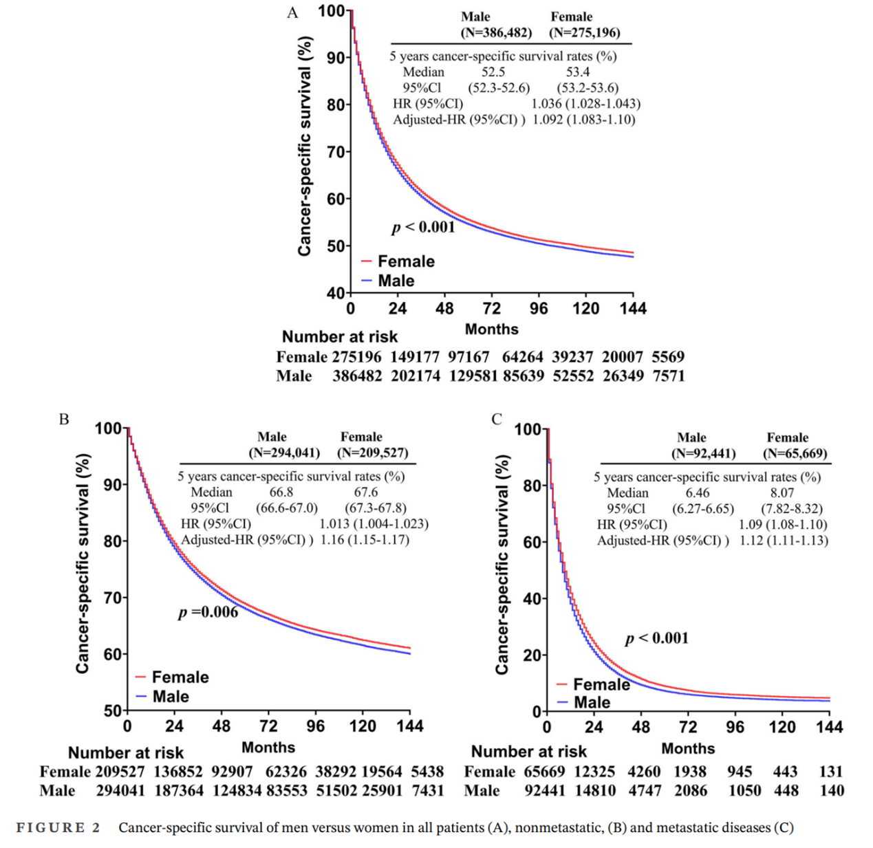 當按原發性癌癥類型進行分層時,女性在肺(HR 1.295,95% CI 1.28–1.31)、肝(HR 1.066,95% CI 1.019–1.115)、結直腸癌(HR 1.037,95% CI 1.022–1.052)、胰腺癌(HR 1.051,95% CI 1.023–1.079)和腎臟(HR 1.142,95% CI 1.104–1.182)中顯示出生存獲益。