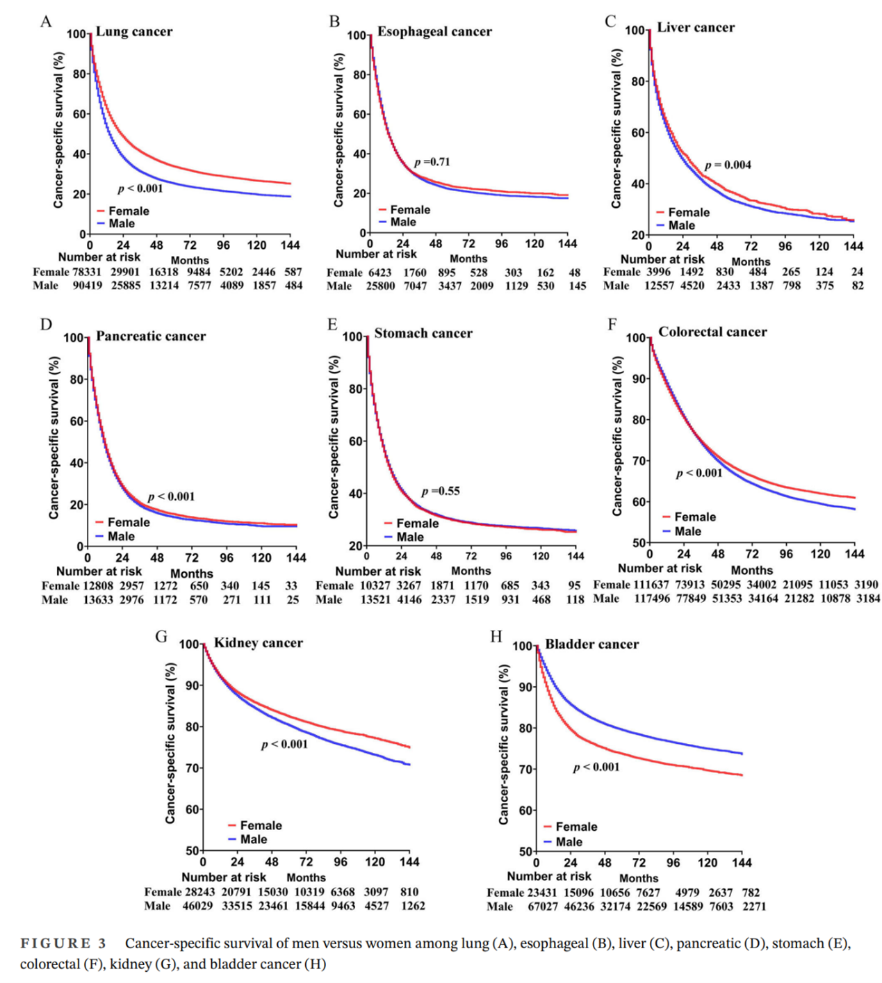 但目前男性和女性癌癥患者之間癌癥特異性生存差異的研究結果存在爭議。因此,本研究從監測流行病學和最終結果(SEER)數據庫中納入了來自最普遍癌癥(肺癌,食道癌,肝癌,胰腺癌,胃癌,結直腸癌,腎癌和膀胱癌)的數據,提供了癌癥預后的性別差異概述。