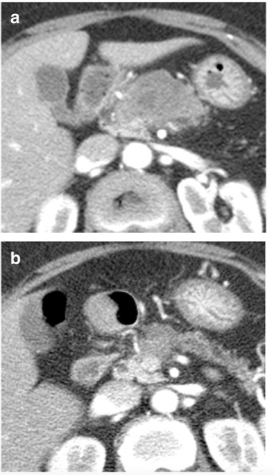 圖 70歲女性,因胰腺癌接受新輔助治療。(a)在診斷時(shí)和(b)新輔助治療后的增強(qiáng)CT圖像。所有六位閱讀者對(duì)再分期CT的腫瘤可切除性評(píng)估為 "邊緣-可切除"。五位閱讀者評(píng)估腫瘤反應(yīng)等級(jí)為1(反應(yīng)良好)。由于腫瘤周圍的纖維化和粘連,進(jìn)行了門靜脈/腸系膜上靜脈切除和端對(duì)端吻合術(shù),但病理檢查沒有靜脈侵犯的證據(jù)。切緣為陰性,YpT2N0分期。