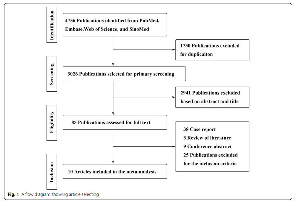 本文共納入10項研究。檢索和納入研究的流程圖如圖1所示。文章的基本研究特點如表1。1986年至2018年間來自不同國家的納入隊列研究中的患者人數從106人到587人不等。在納入的10篇文章中,有6項研究被篩選為高質量(NOS評分≥6)。